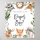 Lassen Sie Ihre Gäste mit unseren Waldtieren eine hübsche Tour durch den Wald und schätzen Sie, was das Windeltaschen-Schild enthält. Freuen Sie sich auf die Aquarellwiesen Eukalyptusgarage und den eleganten handgeschriebenen Schriftart.