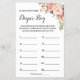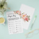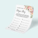 Rosa Blume Was ist in der Windelbeutel Baby Shower Game Card? Fügen Sie dem Design den Wortlaut hinzu. Für weitere Anpassungen (andere Formulierungen, Schriftart, Stil des Schriftartes), klicken Sie auf Personalisieren, scrollen Sie nach unten und klicken Sie auf den Link "Klicken Sie auf, um weitere Anpassungen vorzunehmen". WIE MAN SPIELT: Füllen Sie einen Windelbeutel mit 12 Babynahrungsmitteln, die Gäste werden Babyartikel aufschreiben, von denen sie denken, dass sie in der Windeltasche sind. Die Person mit den korrektesten Schätzungen gewinnt.