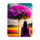 Der farbenfrohe Magnet zeichnet sich durch einen surrealen traumhaften Hintergrund aus, in dem eine Frau über eine weitläufige, von Bergen gesäumte Wiese mit großer Mitte lila Blume blickt. Rumi suchen Zitat in modernen Skript-Schriftart überlagert den Himmel. Mit AI-Software erstellte Bilder.