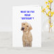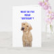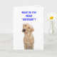 Auf dem vorderen Mosese, der seinen Kopf und den Text kippt: "Was tun Sie gemeiner "Geburtstag"? Innerhalb ist ein Labrador-Party und -text: "Dieses fordert eine Feier! ALLES GUTE ZUM GEBURTSTAG!" Sie können irgendwelche des Textes, des Schriftartes und der Farben des Schriftartes besonders anfertigen.