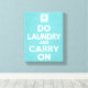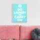 © Pela Studio / Wilder Apple. Das Bild enthält eine blaue Box mit weißem Text, in der Wäsche waschen und tragen. Ideal für die Anzeige auf Waschplätzen.