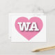 Auf dieser Postkarte befindet sich ein cooles rosafarbenes Herz mit den fett-weißen Großbuchstaben WA, der offiziellen Abkürzung für Washington, dem immergrünen Staat. Die Rückseite der Postkarte ist leer und wartet auf Ihre handgeschriebenen Stimmungen oder Ihren personalisierten Text.