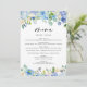 Whimsikale und elegante Blumenkarte, perfekt für Hochzeiten, Babyduschen, Brautpartys, Gartengarten Party, Abschlüsse, Geburtstage und ähnliche Veranstaltungen. Diese Karte mit Blumenkranz bietet lila und blaue Hydrangeas, Peonies und Blattwerk.