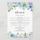 Wassercolor Blue Hydrangea Wedding Menu Menükarte