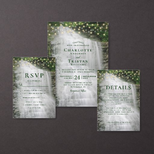 Mit dieser bezaubernden, waldbezogenen Save the Date-Karte, die ein Foto eines herrlichen, seidenweißen Wasserfalls mit Lichtern aus der Saite bietet, verkünden Sie Ihren Hochzeitstag. *Wenn Sie weitere Artikel mit diesem Design oder anderen Design-Anpassungen wünschen, kontaktieren Sie mich bitte über Zazzle.