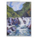 Akrylisches Gemälde eines Wasserfalls mit Wasser, das über die Felsen unter sich fällt; Bäume im Hintergrund Set vor einem blauen Himmel mit weißen Wolken. Leere Karte für deine eigene Nachricht.