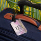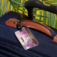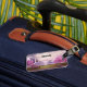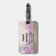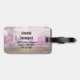 Gepäckanhänger mit landschaftlichem Bild eines friedlichen lila Sees. Umgeben von üppigen Kirschbäumen und Wasserfällen.