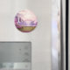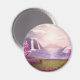 Ein Magnet mit einem landschaftlichen Bild eines friedlichen lila Sees. Umgeben von üppigen Kirschbäumen und Wasserfällen.