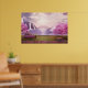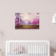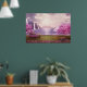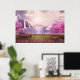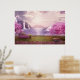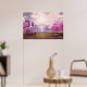Poster mit einem landschaftlichen Bild eines friedlichen lila Sees. Umgeben von üppigen Kirschbäumen und Wasserfällen.