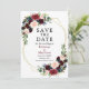 Die elegante Watercolor Burgundy Blumen Save the Date Wedding Announcement Card beinhaltet bordeauxrote Rose, blaue Blumen, rosa Rosen, rote Blume und grüne Farben auf einem geometrischen Rahmen.