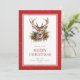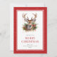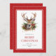Rotes Aquarell Frohe Weihnachtskarte mit einer Aquarellbild eines Hirsches umgeben von Weihnachtsdekoration von Heiligen, Kiefern und Weihnachtsschmuck. Personalisieren Sie diese rote Aquarellkarte einfach mit Ihrem Familiennamen und Text.
