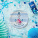 Blumenstrauß auf nautischem Anker mit Seil und wasserfarbigen Streifen.
