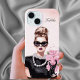iPhone-Gehäuse mit eleganter Aquarellbilderdarstellung einer glamourösen Frau, die in einer Vintagen ästhetischen Erinnerung an die Mitte des 20. Jahrhunderts stylt. Sie trägt eine übergroße schwarze Sonnenbrille, ein schwarzes Kleid, lange schwarze Handschuhe und weiße Perlenhalsketten mit einem Bouquet rosa Rosen. Ihr Haar ist in klassischer Ausführung gestylt, ergänzt durch das raffinierte Aussehen, ergänzt durch große Ohrringe und ein Armband, was zu ihrem eleganten und zeitlosen Aussehen beiträgt. Der Hintergrund ist eine weiche, rot-rosa Aquarellstruktur mit subtilen goldenen Fesseln. Anpassbarer Name in einem stilvollen, kursiven Schriftart in der oberen rechten Ecke. Entwickelt für iPhone 15; zusätzliche Größen und Stile verfügbar.