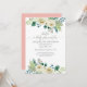 Weiß, Elfenbein, Vintage Alabaster-Rose mit blau-grünem Blattwerk und Eukalyptusblätterblättern, die über und unter Ihrer Babydusche-Einladung stehen. Auf der Rückseite ist ein warmer Korallenrot rosa Hintergrund mit dem Blumenkranz. Ein Kalligraphie-Schriftzeichen-Text lautet: "Eine Babydusche für." in einem olivgrauen Grün. Art Copyright, Audrey Jeanne Roberts.