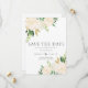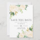 Eine schöne klassische Hochzeit speichern das Datum mit Eckarrangements von Aquarellfarben Rose in Weiß und Elfenbein, Grün und Gold Blätter, mit einer Touch von Imitaten Glitzer. Personalisieren Sie Ihre Hochzeitsdetails in grauem Schriftart.