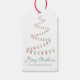 Niedlicher Aquarellstrand von Urlaubsleuchten bildet einen hübschen Weihnachtsbaum über Frohe Weihnachten in lustiger, kursiver grüner Schrift. Passen Sie diese lustigen, modernen Geschenkanhänger unter der Serie von Weihnachtsbeleuchtung an.
