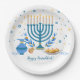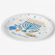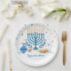 Eine Hanukkah-Szene mit einer Menorah, Sufganiyot (Donuts), dreiblättrigen und Olivenzweigen wird in einem Aquarelleffekt auf dieser Chanukah Platte gerendert. Gut zu benutzen in einem Hanukkah Party für jedes Alter. Verfügbar mit passenden Produkten.