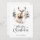 Aquarellwein Weihnachtskarte mit handgeschriebenem Urlaubsgruß und einem Hirsch im Wald an einem schneebedeckten Tag. Personalisieren Sie diese schöne Aquarellkarte einfach mit Ihrem Familiennamen und Text.