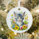 Personalisierte Weihnachtsschmuck. Ai Art zeigt ein niedliches, grau gestreiftes Katzenkätzchen, das in einem Haufen hübscher gelber, rosa und blauer Blumen sitzt.
