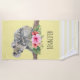 Ein Badetuch in bezauberndem Aquarell. Koala Bär Mutter und Baby. Baby reitet auf dem Rücken der Mama. Stehend auf einem Baumzweig. Ein Hibiskus Blume Bouquet unten. Bananengelber Hintergrund.