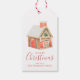 Niedliche und festliche Weihnachtsgeschenke mit einem Aquarellhaus mit "Frohe Weihnachten" in roter Schrift. Personalisieren Sie den Fingerbread Geschenketikett mit Ihrem Namen. Die Rückseite des Tags weist einen schneebedeckten roten Hintergrund auf.