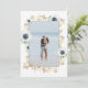 Moderne Aquarellbilder mit einem schönen Rahmen aus Anemonen-Blume, Seestern, Knospen und Zweigen. Elegante Schriftart-Kombination. Weiß, tiefblau, Gold (nicht echtes Gold, sondern Farbe). Benutzerdefiniertes Foto im selben Rahmen auf der Rückseite.