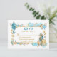 Die moderne Elegant Watercolor Seashells Coral Coastal Blue Wedding RSVP Card beinhaltet Muscheln, Korallen, Seepferde und Seestern. Goldrahmen.