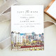 Dieses Datum speichern zeigt ein Aquarellbild der Skyline von San Diego, Kalifornien und moderne, minimalistische Schriften für ein unterhaltsames Ziel themed. Dieses Design ist perfekt für Ihre Südkalifornische thematische Hochzeit oder Veranstaltung.