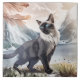 Aquarellbilder einer schwarz-weißen, flauschigen Katze, die vor einem Bergsee im Gras stehend ist.