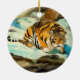 Der Tiger kauert im Schnee, beobachtet vielleicht eine Bewegung in der Bürste oder läppt ein cooles Wintergetränk