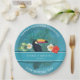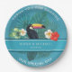Farbenfrohe Hochzeitszettel-Teller mit einem waagerechten, aquamarinen Rahmen, umgeben von Blüten aus Aquarellfarben, einem kühlen Toucan und üppigen Blätter aus Palmen. Der mehrfache, palmenblättrige Hintergrund ist optional und kann bei Bedarf in Weiß geändert werden. Dieses tropische Design ist ideal für Sommer-, Strand- und tropische Hochzeiten, Geburtstage und andere besondere Veranstaltungen. Suchen Sie die ID577, um passende Produkte anzuzeigen.