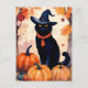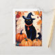 Aquarellmalerei einer schelhaften Schwarzkatze, die einen Hexenhut trägt und den Halloween-Festlichkeiten eine zusätzliche Touch der Magie verleiht. Umgeben von bunten Kürbissen und Herbstlauben ist die Szene mit den lebhaften Herbsttönen lebendig.