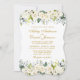 Wasserfarbe Elfenbeinweiße Blumengrün Hochzeitseinladung Karte beinhaltet Elfenbein cremefarbene Rosen und botanische Vegetation. Goldenes Skript, dunkelblauer Rücken, Bracket Style