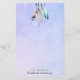 Extravagante Schreibwaren mit Ihrem personalisierten Namen. Ein Aquarelldesign mit vier zarten, zarten Federn, die an der oberen Grenze hängen. Der Hintergrund ist eine weiche, lila blaue Aquarelltextur. Ein Stammesmotiv mit amerikanischem Stil.