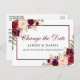 Moderne Elegante Wasserfarbe Burgund Marsala Floral Ändern Das Datum Hochzeit Postponement Postcard bietet bordeauxfarbene Rose, rosa Rosen und Grün