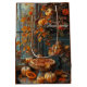 Glückliche Thanksgiving Begrüßungsgeschenktasche mit einer Aquarellbildervorstellung eines Erntedanks mit Herbstlauben im Hintergrund und Kürbiskuchen und Kürbissen im Vordergrund.
