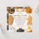 Aquarellfarben Orange und Schwarzes Halloween-Cookie-Design mit Kürbis, Geist, Fledermaus, Süßmais, Skelett, Särge und Spinnenkochen mit Goldkobeln aus Glitzer