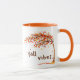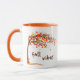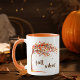 Kaffeemaschine mit Aquarell-Tasse eines Sturmbaums an einem windigen Tag mit blühenden und fallenden Blätter in Herbstfarben. Das Skript Fall Vibes zentriert sich unter dem Baum in einer Schriftart-Farbe, um Abbildungen. Das Bild wird auf der Rückseite der Tasse wiederholt und umgekehrt. Zusätzliche Felgen- und Grifffarben sind verfügbar. Zusätzliche Stile verfügbar.