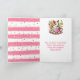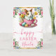 Elegantes Watercolor Osterkaninchen im Blumenbecherdesign mit Ostereiern und rosa und blauen Frühlingsblumen mit rosa Streifen Hintergrund