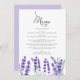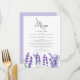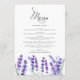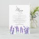 Fügen Sie Ihrem Event mit diesen Lavendel-Menükarten einen eleganten Blumenakzent hinzu. Es zeigt Aquarellbilder von Lavendel-Blume. Personalisieren Sie diese durch Hinzufügen von Namen und Menüdetails. Diese lavender Blumenkarten sind perfekt für Frühjahrshochzeiten. Brautpartys, Babyduschen, Geburtstage und ähnliche Partys.