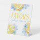 Gastgeschenk Bitte nehmen Sie ein Stehendes Pedestal-Zeichen. Freuen Sie sich auf Watercolor Lemons, schöne, elegante, staubige Schieferblau-Blumen und das Champagnerglas in Aquarelltönen. Ideal für Brautparty, Hochzeit oder Babydusche!