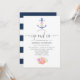 Trendy Marine und White nautical Thema Schlucken und sehen Einladungen mit einem Aquarell Blumenanker, Blume und Marinestreifen auf der Rückseite.