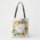 Begrüßen Sie die Wärme der Saison mit dieser personalisierten Wasserfarbe-Sonnenblumen-Blumen-Tasche mit Monogramm. Dieses elegante Design zeigt einen lebendigen Strauß aus gelben Sonnenblumen und üppigem grünem Laub, kunstvoll um einen schicken geometrischen goldenen Rahmen angeordnet.