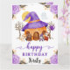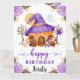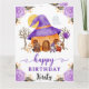 Niedlicher Wasserfarben-Trick oder Treat Halloween-Design mit Kürberhaus, Bären, Fuchs, Hund und Waschbären in Kostümen, einem Geist und lila und schwarzen Blume
