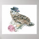 Dieses Design zeigt ein Aquarellporträt einer Eule, die sich in einem Hut und rosa Rosen posiert.