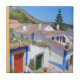 Aquarell mediterranes Dorf mit weißen Häusern und roten Fliesen mit Blick auf die Straße in Portugal