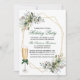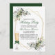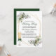 Elegante Watercolor Greenery Holiday Party Einladung beinhaltet wunderschöne botanische Aquarellen, Eukalyptus-Blätter, Heilige Beeren und andere schöne Blätter. Geometrischer Rahmen. Rotes Skript. Champagnerglas mit grünem Bow.