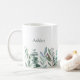 Genießen Sie Ihren Lieblingskaffee oder -tee mit einer Note ruhiger botanischer Schönheit. Diese personalisierte Eukalyptus-Kaffeetasse zeigt ein weiches Wasserfarbengrünpflanzendesign, das sich entlang der Basis windet, gepaart mit Ihrem individuellen Namen in einer eleganten Serifenschrift.