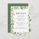 Stilvolle, elegante Hochzeitskarten mit einer bemalten, wasserfarbenen Blattlinie in lebhaften Frühlingshöhen und Moosgrün, die Ihre Hochzeitsdetails wie Hotelunterkünfte, Hochzeitswebsite, Anfahrtsbeschreibungen oder andere wichtige Informationen umrahmen.