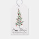 Moderne Elegante Kalligraphie Tinte Wasserfarben Pinienbaum mit Burgundy Red Ribbons und Weihnachtsschmuck Happy Holidays Gift Tag